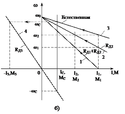 Рисунок 2 - Схема пуска двигателя постоянного тока в две ступени в функции ЭДС и динамического торможения в функции времени (а), механические характеристики (б)