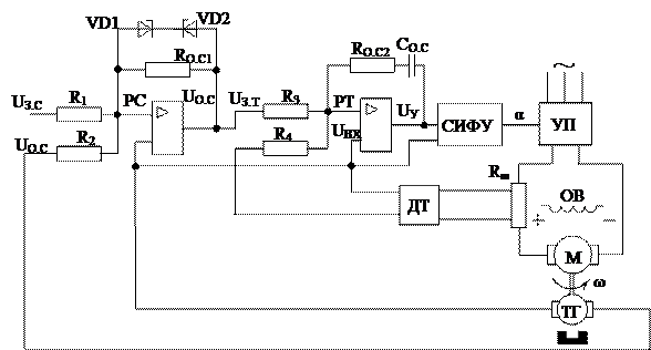 Как уже отмечалось, схема подчиненного регулирования координат позволяет простыми средствами ограничивать координаты ЭП на заданном уровне. В схеме для ограничения тока и момента в цепь обратной связи PC включены стабилитроны VDI и VD2. В результате этого выходное напряжение PC, являющееся задающим сигналом (уставкой) тока Uз.т, ограничивается и тем самым ток и момент двигателя не могут превзойти заданного уровня.