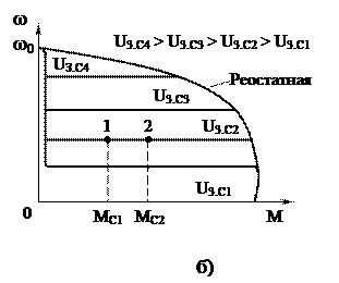 Рассмотрим работу ЭП при изменении момента нагрузки Мс на валу АД и постоянном задании скорости сигналом U3.С2. Допустим также, что в исходном положении АД работал в точке 1 при моменте нагрузки MС1 (рис. 1,б), а затем произошло его увеличение до значения МС2.