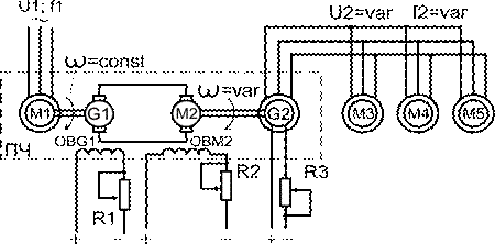 От синхронного генератора G2, являющегося источником напряжения с переменной частотой и амплитудой, питается один или группа асинхронных двигателей с короткозамкнутым ротором МЗ — М5. Меняя направление тока возбуждения генератора постоянного тока G1, можно изменять направление вращения асинхронных двигателей. При неизменном токе возбуждения синхронного генератора G2 и двигателя постоянного тока М2, меняя его угловую скорость, можно автоматически регулировать выходное напряжение по закону U2/f2=const. В данном случае, со снижением частоты снижается перегрузочная способность асинхронных двигателей и поэтому диапазон регулирования при постоянном моменте нагрузки заметно уменьшается. Больший диапазон регулирования с обеспечением необходимой перегрузочной способности (по отношению к статическому моменту нагрузки) может быть получен при вентиляторной нагрузке.