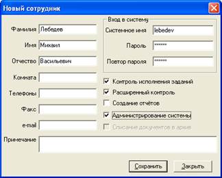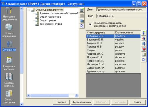 11. нажмите на кнопку Сохранить, чтобы завершить регистрацию нового сотрудника. После этого его имя появится в списке сотрудников данного подразделения, и он сможет подключаться к системе Документооборота и работать в программе ЕВФРАТ- Документооборот;