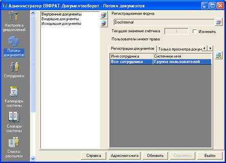 - на правой панели выберите вкладку Регистрации документов или Только просмотра документов, показывающую список сотрудников, имеющих права на регистрацию и редактирование или только просмотр документов выбранного потока документов соответственно;