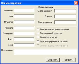 3. Создав подразделение, вы можете зарегистрировать в системе пользователей, относящихся к нему (не менее трех пользователей для каждого подразделения). Для этого щелкните мышью по кнопке Добавить нового сотрудника. В открывшемся диалоговом окне введите сведения о пользователе: фамилию, имя и отчество, служебные телефоны, адрес электронной почты, а также учетное имя (пароль для входа в систему вводить не обязательно).