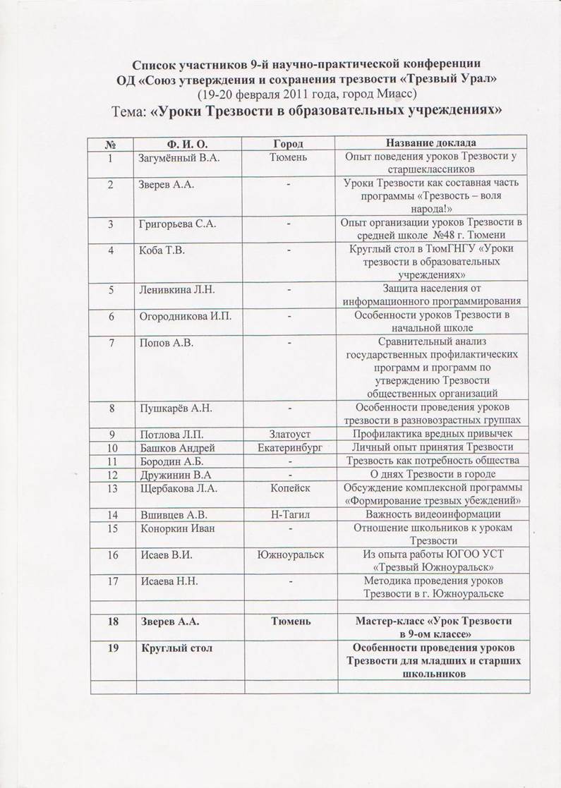 1. Список участников и тем докладов на 9-й научно-практической конференции ОД «Союз утверждения и сохранения Трезвости «Трезвый Урал» 19-20 февраля 2011 года, город Миасс. Тема конференции: «Уроки Трезвости в образовательных учреждениях».