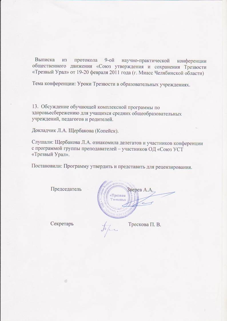 2. Выписка из протокола 9-й научно-практической конференции ОД «Союз утверждения и сохранения трезвости «Трезвый Урал», февраль 2011 года, город Миасс.