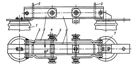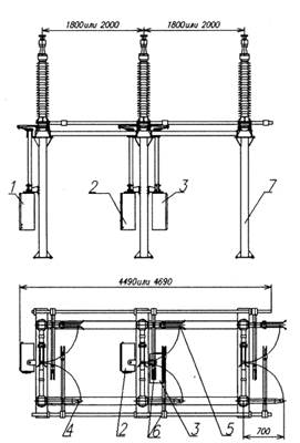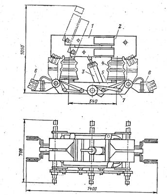 1 – подвижные главные ножи; 2 – неподвижный контакт; 3 – фарфоровая тяга; 4 – опорный изолятор; 5 –рама; 6 – заземляющие ножи; 7 – механическая блокировка между главными и заземляющими ножами.