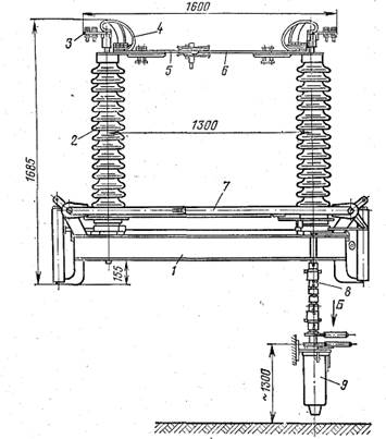 1 – рама; 2 – опорный изолятор; 3 – наконечник для присоединения шин; 4 – гибкая связь; 5 – главный нож с ламелями; 6 – главный нож без ламелей; 7 – заземляющие ножи; 8 – тяга к приводу; 9 – привод.