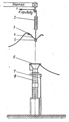 Подвесной разъединитель имеет подвижную контактную систему, состоящую из груза 5, снабженного пружинящими лапами 4 и контактными наконечниками 3, к которым приварены токоведущие провода. Вся эта система подвешена на гирлянде изоляторов 2 к порталу. Неподвижная контактная система состоит из кольца 6, укрепленного на опорных изоляторах или на трансформаторе тока 8. В отключенном положении подвижный контакт поднят. При включении освобождается трос 1, идущий к приводу, груз опускается вниз и наконечники 3 приходят в соприкосновение с кольцом 6 – цепь включена. При отключении разъединителя груз поднимается. Для заземления отключенного разъединителя используется телескопический заземлитель 7 с ручным приводом.