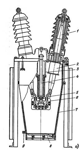1 – ввод; 2 – трансформатор тока; 3 – корпус приводного механизма; 4 – штанга; 5 – неподвижный контакт; 6 – дугогасительная камера; 7 – внутрибаковая изоляция; 8 – нагревательное устройство; 9 – маслоспускное устройство.