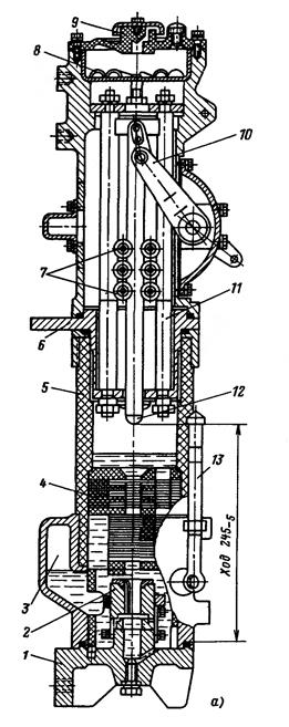 Полюс выключателей ВМП (масляный, подвесной) и ВМГ (масляный, горшковый) состоит из прочного влагостойкого изоляционного цилиндра 5 (стеклоэпоксидный пластик), торцы которого армируются металлическими фланцами. На верхнем фланце изоляционного цилиндра укреплен корпус из алюминиевого сплава, внутри которого расположены: приводной выпрямляющий механизм, подвижный контактный стержень, роликовое токосъемное устройство и маслоотделитель. Нижний фланец из силумина закрывается крышкой, внутри которой вмонтирован розеточный контакт, а снаружи пробка для спуска масла. Внутри цилиндра над розеточным контактом имеется гасительная камера, собранная из изоляционных пластин с фигурными отверстиями. Набором пластин создаются три поперечных канала и масляные карманы. Во включенном положении контактный стержень находится в розеточном контакте. При отключении привод освобождает отключающую пружину, находящуюся в раме выключателя, и под действием ее силы вал выключателя 6 поворачивается, движение передается изоляционной тяге 4 а от нее приводному механизму 10 и контактному стержню, который движется вверх. При размыкании контактов возникает дуга, испаряющая и разлагающая масло. В первые моменты контактный стержень закрывает поперечные каналы дугогасительной