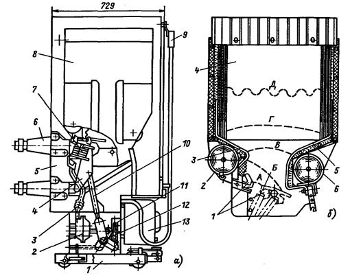 На сварном основании 1, установленном на катках, крепятся привод 13, три полюса 5, состоящих из двух изоляционных стоек, на которых крепятся два проходных эпоксидных изолятора 6 с розеточными контактами. На верхнем изоляторе смонтированы неподвижные контакты 7, на нижнем – подвижные контакты 4, связанные изоляционной тягой 10 с валом выключателя 12. Последний соединен с приводом 13 с помощью рычагов 11 и тяг. Дугогасительные камеры 8 крепятся на неподвижном контакте в специальных стойках. Каждый полюс изолирован кожухом. Передняя часть кожуха обшита металлическим листом, надежно заземленным вместе с рамой выдвижного элемента КРУ. Цепи вторичной коммутации заключены в металлический шланг и заканчиваются штепсельным разъемом 9.