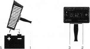1. Подсоединить провод с зажимом (1) к клемме «-«АКБ, а щупом (5) осуществить контакт на клемме»+» без нажатия на нее.