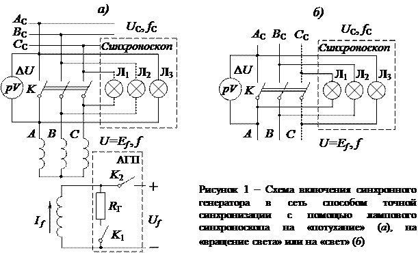 Простейшая схема точной синхронизации с помощью лампового синхроноскопа изображена на рисунке 1. Устройство из ламп Л1, Л2, Л3, включенных в рассечку фаз параллельно контактам выключателя K называется синхроноскоп.