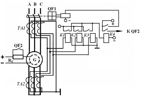 ). Повреждения внутри обмоток СГ или на генераторном фидере нарушают баланс тока и вызывают срабатывание соответствующего реле, а промежуточное реле К4 подает импульс на отключение ГВ (генераторного выключателя) QF1 и АГП (автомата гашения поля) QF2. Дифференциальная защита отличается высокой чувствительностью, быстродействием и компактностью по сравнению с другими видами аналогичных защит.
