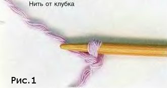 Выполните первую петлю обычным образом и расположите нити на указательном и большом пальцах как при простом способе набора (короткий конец нити на большом пальце, нить от клубка - на указательном)(рис.1).