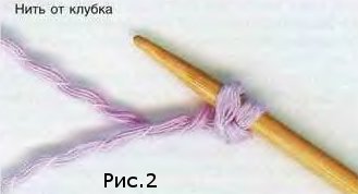Спицу острием от себя подведите под нить, идущую от большого пальца, и захватите нить на указательном пальце, идущую от клубка. После выполнения приема образовалась лицевая петля (рис.2).