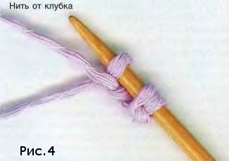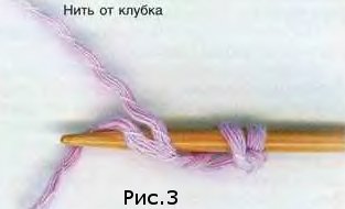 Спицу острием на себя подведите под нить на указательном пальце, идущую от клубка. Захватите нить, расположенную на большом пальце (рис.3), вытяните ее из-под нити на указательном.