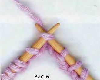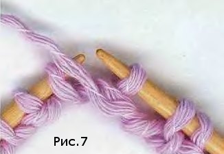 После набора край можно оформить "итальянским" способом, для этого провяжите 4 ряда двойным вязанием, т.е. лицевую петлю провязывайте (рис.6), а изнаночную снимайте, нить перед петлей (рис.7).