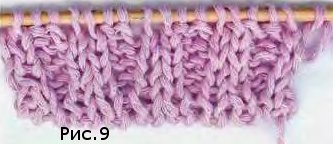 Для того, чтобы перейти на выполнение резинки 2x2 (рис.9), необходимо помнить: во-первых, количество петель при наборе должно быть кратно 4 плюс 2 кромочные; во-вторых, рядом с кромочными петлями будет только по одной лицевой или изнаночной. Так как набор осуществляется по принципу "одна петля перед нитью, другая за нитью", затем первые вяжутся лицевыми, а вторые изнаночными, то невозможно набрать на две петли больше тех или других. Следовательно, необходимо набрать одинаковое количество для симметричного расположения рисунка и провязать рядом с кромочной по одной лицевой или изнаночной, в противном случае у одной кромочной будет две лицевые петли, у другой две изнаночные.