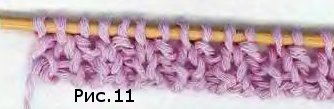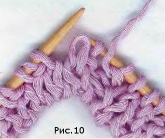 При переходе с двойного вязания на резинку 2x2 следует некоторые петли поменять местами. Например, после кромочной вяжите лицевую, затем изнаночную, следующую лицевую снимите перед работой, провяжите изнаночную по рисунку (рис.10), затем снятую лицевую, потом лицевую по рисунку полотна, изнаночную по рисунку и вновь снимите лицевую петлю перед работой и т.д.
