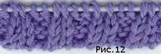 Набрав петли путем переплетения нитей, можно выполнить резинку 1x1 (рис.11) или 2x2(рис.12) сразу, без провязывания 4 рядов двойным вязанием. При выполнении резинки 2x2 следует переставить петли.