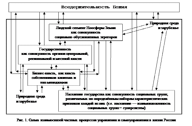 Так же отметим, что на рис. 1 очерёдность расположения субъектов и объектов по вертикали в направлении сверху вниз соответствует иерархическому порядку осуществляемых ими процессов управления в отношении иерархически более низких (в порядке взаимовложенности) процессов: «Вседержительность», «Природная среда и зарубежье»[8], «Людской сегмент Ноосферы Земли», «Государственность», «Бизнес-власть», «Население». На рис. 1 бизнес-власть иерархически — ниже государственности, как в общем-то и должно быть в гражданском обществе и демократическом государстве.