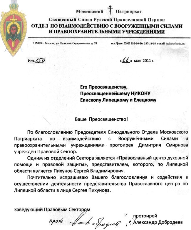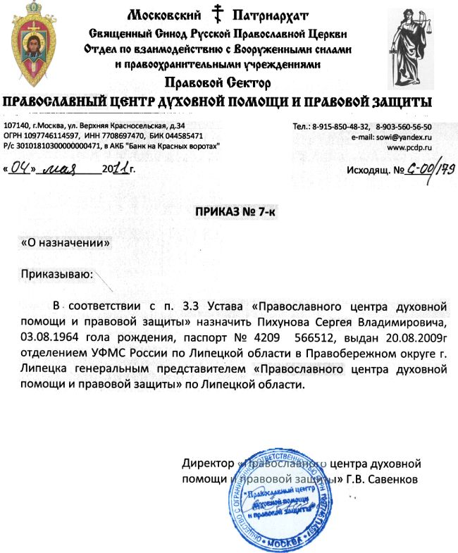 Принято решение об открытии представительства «Православного центра духовной помощи и правовой защиты» в Липецкой области. На должность генерального представителя по Липецкой области назначен Пихунов Сергей Владимировича. Руководитель Правового Сектора Синодального Отдела по взаимодействию с Вооружёнными Силами и правоохранительными учреждениями протоиерей Александр Добродеев благословил Пихунова С.В. на все благие дела и начинания. Открытие очередного представительства расширяет возможности Православного центра по оказанию духовной и правовой помощи людям, попавшим в сложные жизненные ситуации.