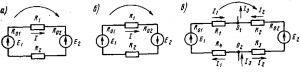 Если в электрической цепи э. д. с. источников электрической энергии при обходе соответствующего контура направлены навстречу друг другу (см. рис. 24, а), то такое включение называют встречным. В этом случае на основании второго закона Кирхгофа ток I = (E1-E2)/(R1+R2+R01+R02).