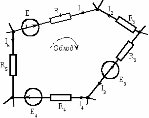На рисунке 6 показана часть сложной электрической цепи в виде замкнутого контура, состоящего из m= 5 ветвей и содержащегоn= 3 источников э.д.с.