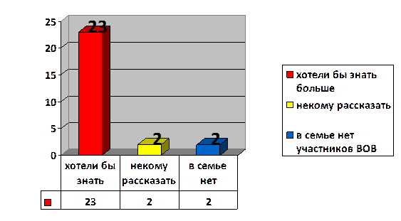 1. Обучающиеся нашей школы мало знают о родственниках, являющихся участниками ВОВ. Самое большое, что известно нашим ребятам это фамилия, имя человека. Информация получена от родителей, фотографии и награды есть только в двух семьях.