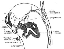 | Рисунок 9 Лицевой нерв и некоторые его связи. Вид через правую среднюю черепную ямку |
