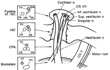 Взаимоотношения между ЛН, акустическим и вестибулярным нервами показаны на рис. 10. Понимание этих тонких анатомических деталей взаимоотношения нерва необходимо при выполнении ретролабиринтной нейрэктомии.