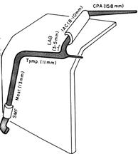 На рис.13 показано место выхода ЛН из височной кости у новорожденного (по отношению к тимпанальному шву и сосцевидному отростку) и рекомендуемое место разреза, на рис.14 обозначено типичное место разреза у взрослых пациентов.