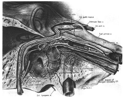 Факт того, что болевые импульсы могут передаваться через ch.tympany, было замечено Duchenne и Blan и подтверждены физиологическими и клиническими исследованиями Costen et al. Последующие исследования показали, что у человека ch.tympany – это прежде всего типичный чувствительный нерв, несущий, кроме того, компонент для специальной вкусовой чувствительности. Rosen отмечал значение ch.tympany для синдрома боли в ухе, основанной на локализации боли у 2-х пациентов при этой операции. Хочется отметить значение этих наблюдений в случае паралича Белла и herpes zoster cephalicus. Похоже, что вовлечение ch.tympany в вирусное воспаление и вирусный иммунный процесс при этих состояниях ответственно за обычно выраженную ушную боль, так же как нарушение вкуса, сопровождающее эти состояния.