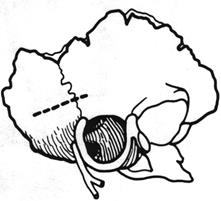 О поверхностной локализации ЛН сразу по выходе из височной кости у маленьких детей (от рождения и примерно до 4-хлетнего возраста) следует помнить хирургу. Чтобы избежать непреднамеренного повреждения ЛН, заушный разрез должен производиться, как указано на рис.13 (у детей) и рис.14 (у взрослых). Хирург в целях защиты ЛН может далее контролировать свои действия, располагая палец в области между сосцевидным отростком и углом нижней челюсти.