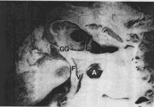 | Рисунок 15 Срез через правую височную кость, показывающий ЛН в его лабиринтном, коленчатом и тимпанальном сегментах. ЛН тесно прилежит к ампулярному концу горизонтального полукружного канала в его лабиринтном сегменте (C- pr.cochleariformis, F-ЛН, V-вестиб.нерв, A-ампула горизонтального и верхнего полукружного каналов, GG- gangl.geniculatum). | |