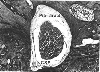 | Рисунок 16 Срез на уровне лабиринтного сегмента ЛН(FN) в височной кости, демонстрирующий его свободное расположение в цереброспинальной жидкости (CSF) без периневрального покрытия. Между нервом и костным каналом остается пространство. |