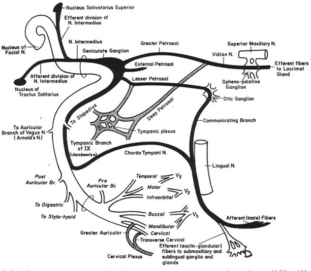 Представляет клинический интерес, что количество волокон ЛН дистальнее gangl.geniculatum больше числа волокон проксимальной части. Van Buskirk заявляет, что проксимальнее gangl.geniculatum находится 7000 волокон, а дистальнее gangl.geniculatum – 10000, 76% миелинизированных и 24% чувствительных. Нерв является наиболее толстым около начала его вертикального сегмента. Описано множество коммуникаций между ЛН и волокнами X и IX нервов, а также нервные узелки, располагающиеся в горизонтальном и вертикальном сегментах ЛН, от которых отходят различные сенсорные волокна. Эти исследования подтверждают теорию, что двигательная порция вовлекается вторично при лицевых параличах, будучи сдавленной набухшими чувствительными волокнами внутри фаллопиевого канала.