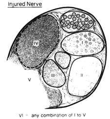 Пучок нервного волокна, изображенный «на 12 часах» - нормальный. Двигаясь по часовой стрелке, следующий пучок нервных волокон демонстрирует I степень повреждения (нейрапраксия) с сегментарными участками демиелинизации. На следующем нервном пучке показана II степень повреждения (аксонотмезис). При этом вовлекается как сам аксон, так и миелиновая оболочка. Эндоневральные ткани не повреждаются. Два пучка, расположенные в центре, демонстрируют III степень повреждения – с повреждением аксона, миелина и эндоневрия. Периневрий остается интактным и нормальным. Нервный пучок, демонстрирующий IV степень поражения, расположен на «10-11 часах», при этом характерны значительно выраженные изменения в самом нерве, интактным остается только эпиневрий. При V степени повреждения нарушается целостность нервного волокна на пртяжении (нейротмезис). VI степень представлена различными комбинациями вышеуказанных степеней поражения.