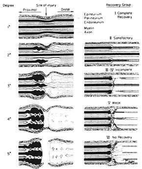 | Рисунок 21 Классификация поражений нерва по степеням (по Sunderland): 1 – компрессия без изменений в структуре, полное восстановление; 2 – дегенерация аксона, регенерация соответствующая, восстановление хорошее; 3 – уменьшение количества нервных трубочек, восстановление неполное с развитием синкинезий, 4 – разрыв периневрия, восстановление очень слабое, 5 – полный разрыв, восстановления нет. |