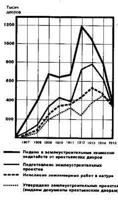 С 1905 по 1916 гг. из общины выделилось около 2,5 млн. домохозяев, (включая 470 тыс. дворов в беспередельных общинах, из которых выход был обязателен), что составляло 22% всех крестьянских хозяйств, владевших 14% всей общинной земли. Общину покидали зажиточные крестьяне и крестьяне-бедняки, которые были заинтересованы в закреплении за собой земельной собственности с целью ее дальнейшей продажи 1,2 млн. домохозяев, или 60% выделившихся из общины и владевших 8,8% всей надельной земли, свои участки продали. В 1915 г. фермерские хозяйства составили лишь 10,3% всех крестьянских хозяйств. Это свидетельствовало о том, что создать слой крестьян-фермеров и разрушить устаревшую общину, мешавшую развитию капиталистических отношений в сельском хозяйстве, не удалось, тем более, что в подавляющем большинстве выход из общины ограничивался закреплением в личную собственность надельной и усадебной земли.