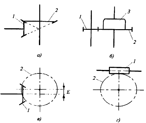 Гипоидная передача (рис. 3.1, в) представляет собой зацепление ведущего 1 и ведомого 2 конических зубчатых колес со спиральным зубом, оси которых не пересекаются, а перекрещиваются. При этом ось шестерни 1 смещена относительно оси колеса 2 на величину гипоидного смещения Е. В зависимости от требований компоновки ось шестерни может быть смещена относительно оси колеса вверх и вниз.