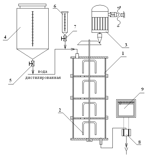 Установка (рис. 2) включает емкостной аппарат 1, состоящий из трех последовательно соединенных секций с мешалкой 2, выполненных из стали. Электропривод мешалки 3 включает коллекторный электродвигатель и вариатор, позволяющий изменять число оборотов вала мешалки в диапазоне от 80 до 500 об/мин. Подача технологических потоков в аппарат осуществляется через штуцер в крышке аппарата, а выгрузка – через нижней штуцер. Дистиллированная вода из мерника 4 поступает в аппарат 1. Расход воды измеряется ротаметром FI и регулируется с помощью вентиля 5. Ввод трассера в аппарат осуществляется на линии подачи воды из мерника 6 с помощью крана 7. В качестве трассера в работе используется водный раствор NaCl. Измерение количества трассера на выходе из аппарата осуществляется кондуктометрической электродной ячейкой 8, показания которой передаются на измеритель-регистратор 9. Включение измерителя –регистратора осуществляется в момент ввода трассера.