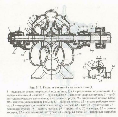 Центробежные насосы типа Д (рис. 5.13) - горизонтальные с осевым горизонтальным разъемом корпуса, с полуспиральным подводом жидкости к рабочему колесу имеют ряд преимуществ с другими типами насосов. Они имеют хорошую всасывающую способность. Рабочее колесо с двусторонним подводом жидкости обладает по сравнению с колесом одностороннего подвода (при одинаковых значениях напора, подачи и частоты вращения) существенно лучшими кавитационными качествами.