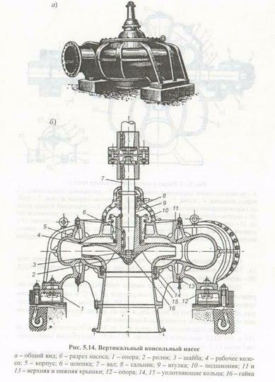 Насосы горизонтальные консольные с односторонним подводом воды и рабочему колесу (рис. 1). Насосы изготавливаются с подачей 5-400 м3/ч напором 10-90 м, их КПД находятся в пределах 0,5-0,84, допустимый кавитационный запас 4-5,5 м, коэффициент быстроходности n s; = 60-250.