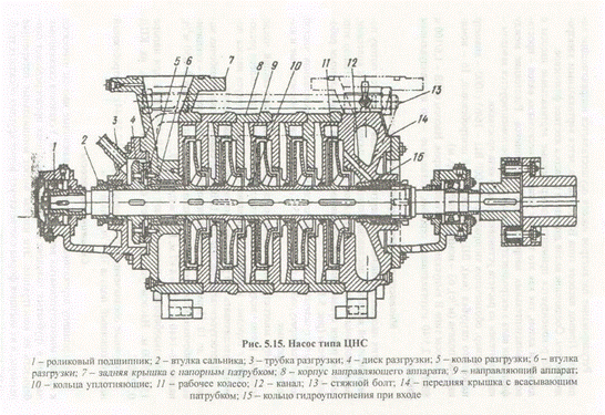 Многоступенчатые насосы типа ЦНС выпускают с числом рабочих колес от 2 до 10. Нормальные насосы изготавливают одного типа - секционные с рабочими колесами осевого входа. Подача этих насосов 8-850 м 3/ч, напор 40-1440 м, Н =4-7 м, КПД = 0,67-0,77.