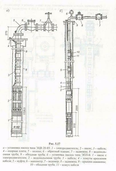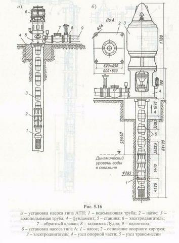 Скважинные насосы изготавливают двух типов: насосы с трансмиссионным валом (артезианские типа А и АТН, рис. 5.16) и погружные (типа ЭЦВ,рис.5.17).