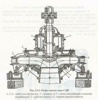 Напорный патрубок насоса типа СДВ расположен горизонтально. К подшипникам скольжения крупногабаритных насосов подводится от системы технического водоснабжения чистая вода для их охлаждения и смазки.