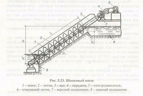 Шнековые насосы (рис. 5.23) предназначены для перекачки сточных вод при подъеме их на небольшую высоту (2-7 м). Насосы отличают простота конструкции и эксплуатации, а также незначительный объем строительных работ при их установки. На насосных станциях не требуется установка арматуры, которая заменяется простыми плоскими щитами.