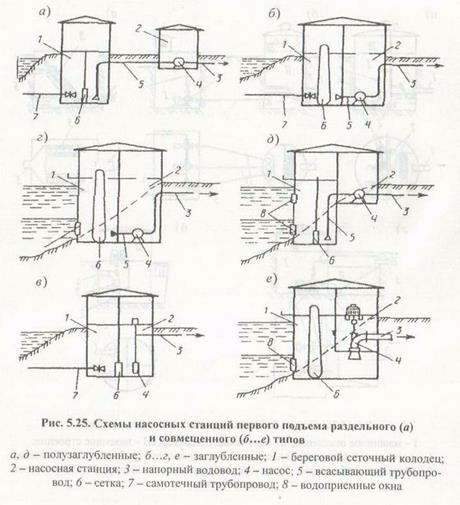 Тип водопроводной насосной станции определяется ее назначением и подачей, а так же зависит от вида и режима источника водоснабжения, расположения здания насосной станции по отношению к водозаборному сооружению, типа и характеристик основного оборудования и систем привода, климатических условий и гидрогеологии местности (рис. 5.25).